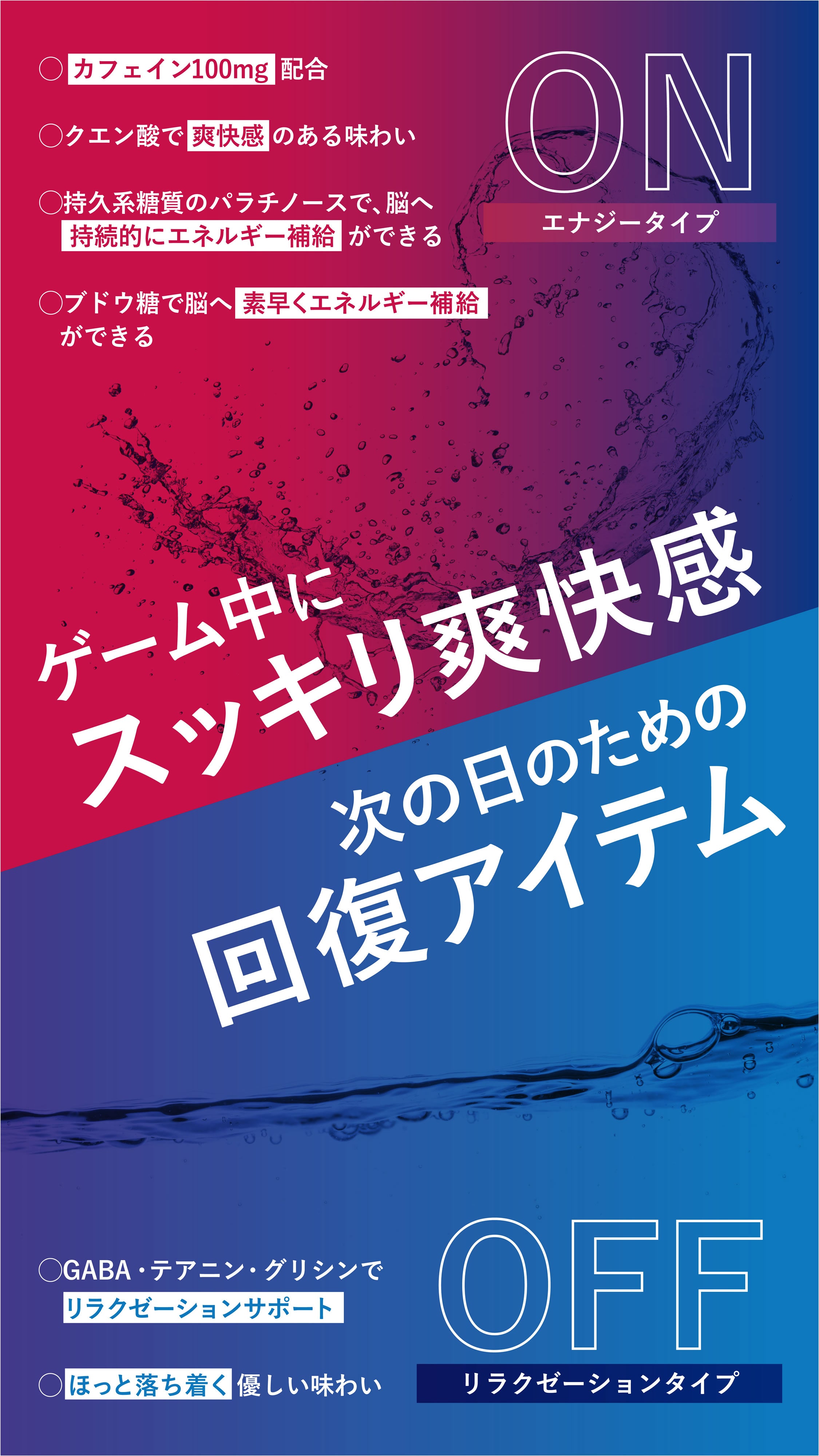エナジードリンクの種類は多くあるが、その反対のドリンクは数えるほどしかない。ゲーム後の興奮状態を考え、グリシン、GABA、テアニンでリラクゼーションサポート。優しい味わいのルイボスミルクティー味でホッと一息。全てのゲーマーを次のステージへ押し上げる回復アイテム